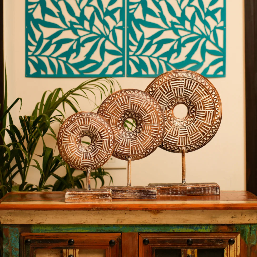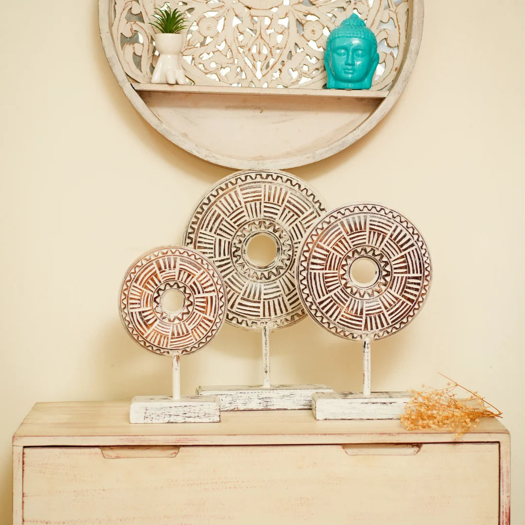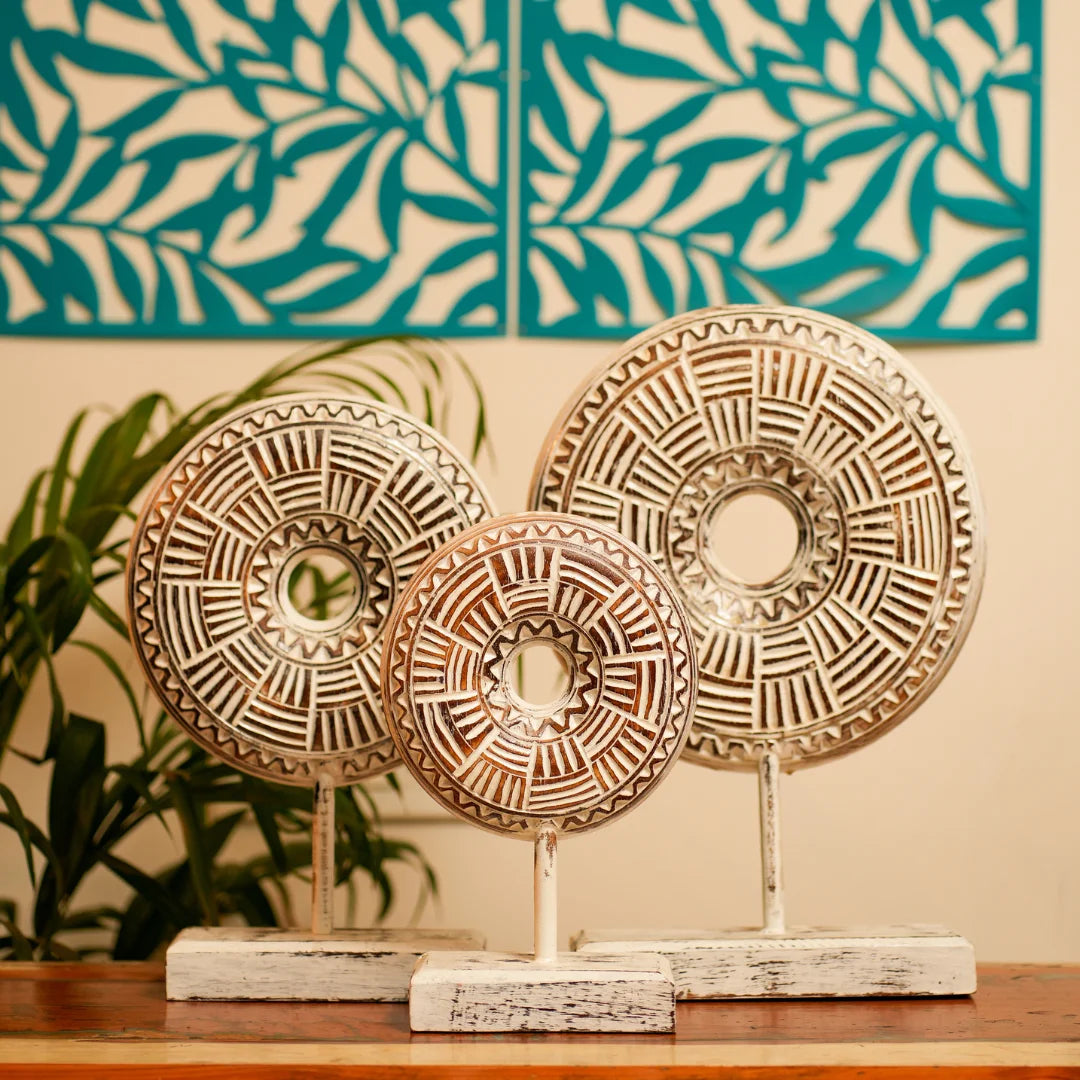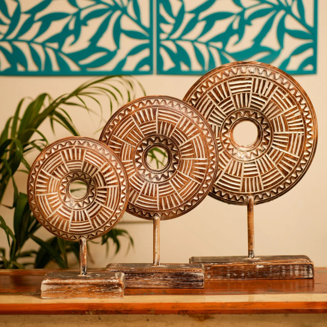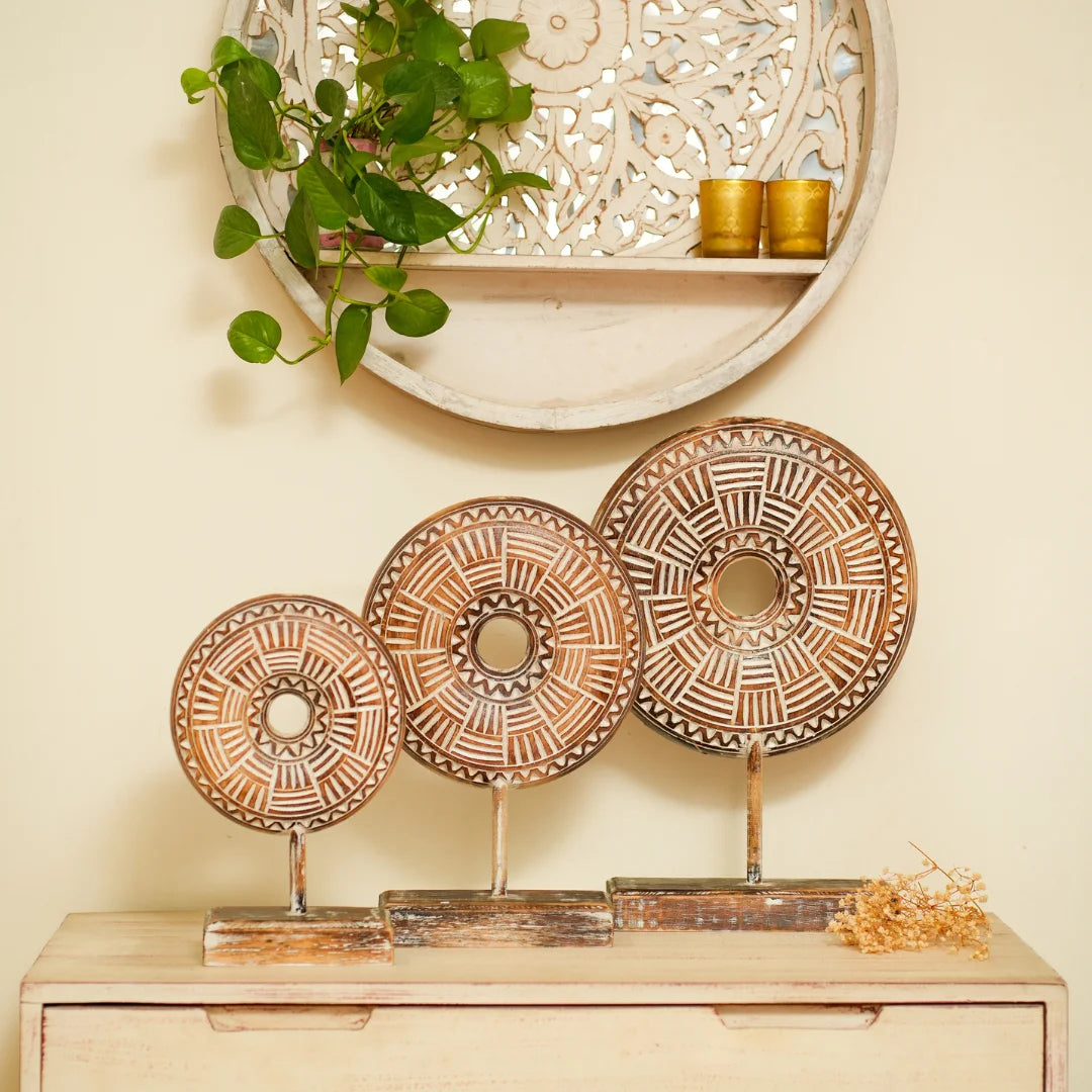 Our Rustic Rounds wooden table decor set is handcrafted from high-quality, sustainably sourced wood. Each of the three round pieces features a unique, distressed finish, showcasing the natural grain and texture of the wood. Perfect for adding a touch of rustic charm to your home, this set is ideal for coffee tables, side tables, or shelves.