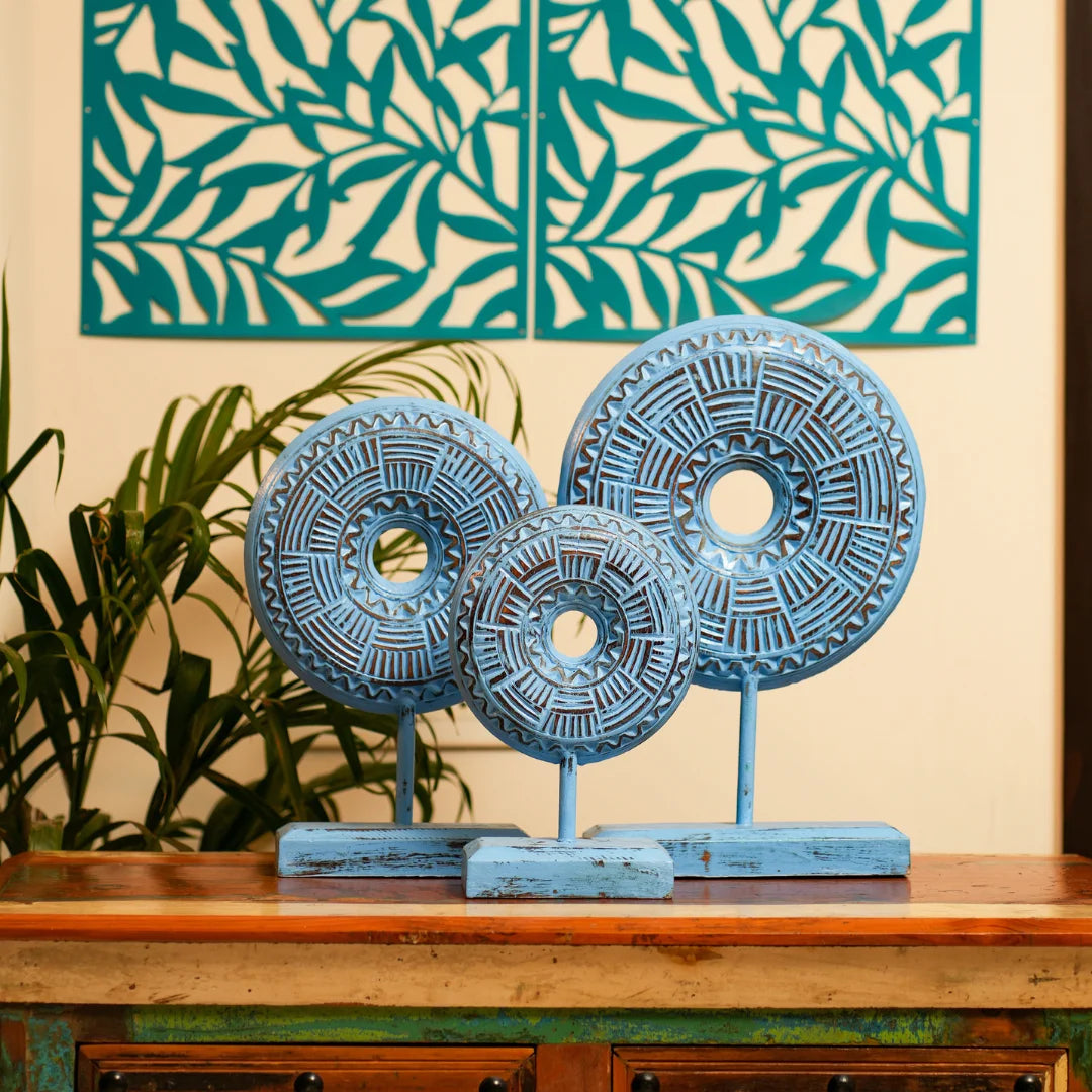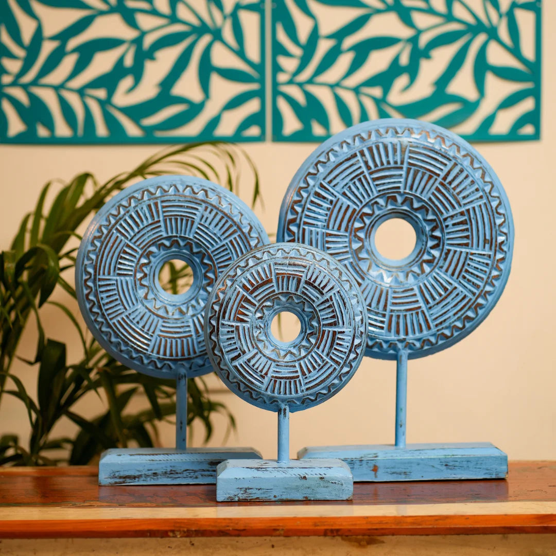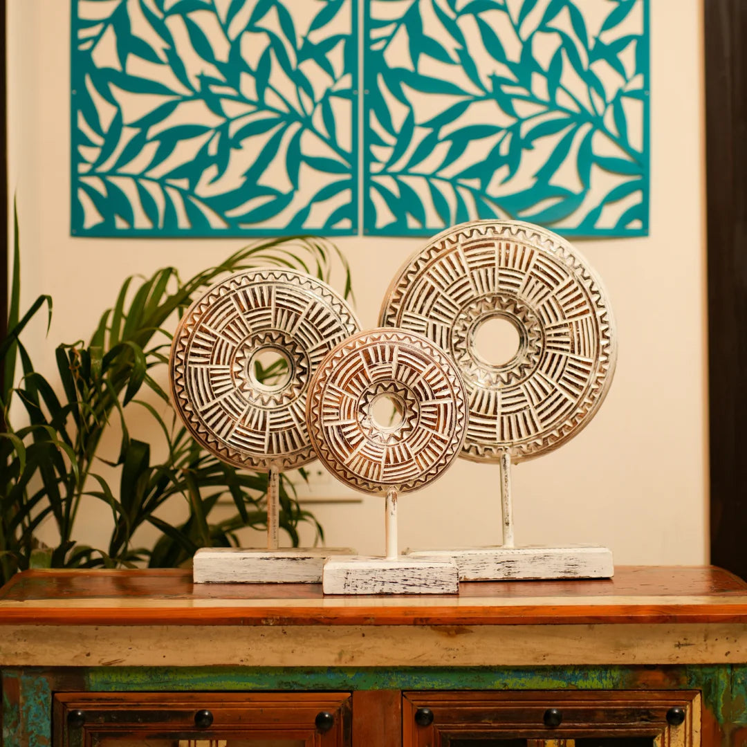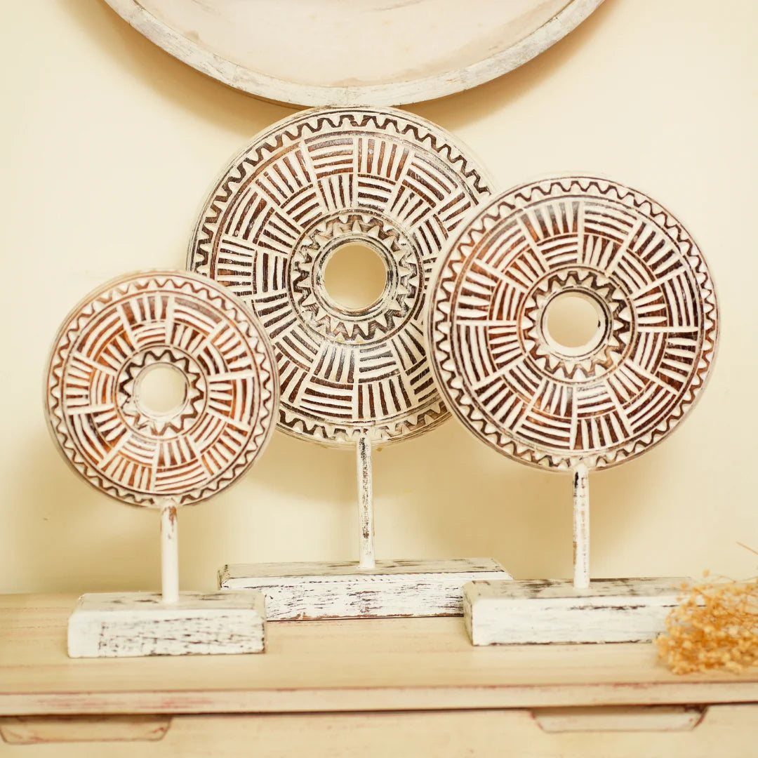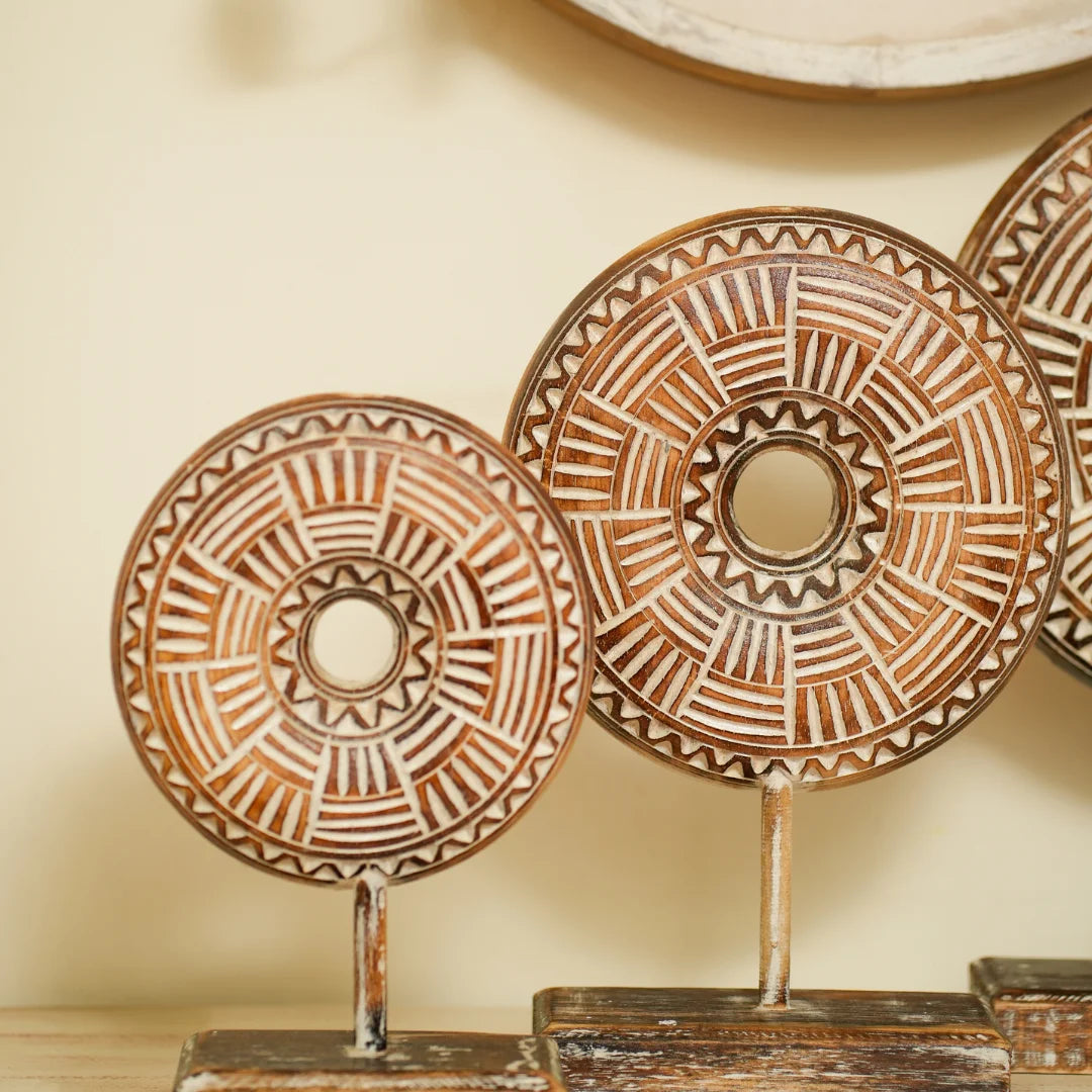 Our Rustic Rounds wooden table decor set is handcrafted from high-quality, sustainably sourced wood. Each of the three round pieces features a unique, distressed finish, showcasing the natural grain and texture of the wood. Perfect for adding a touch of rustic charm to your home, this set is ideal for coffee tables, side tables, or shelves.