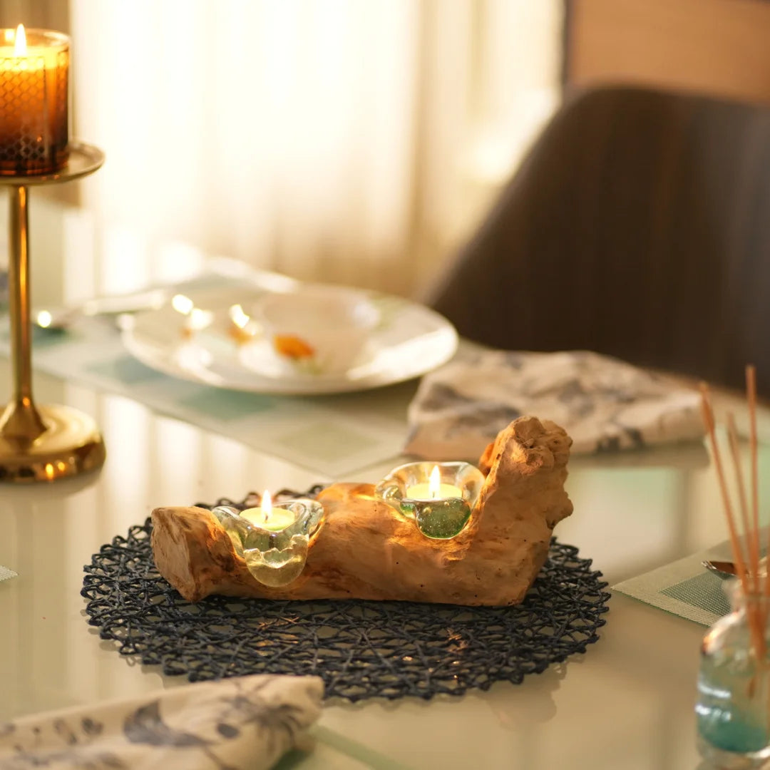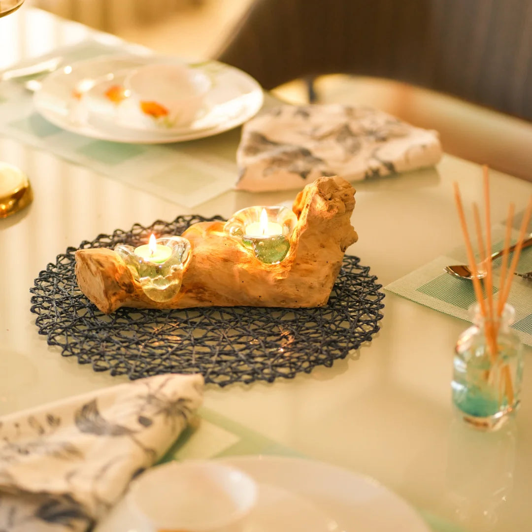 Timber Kala's 2 Glass Woodfire for Decor showcases the natural warmth of wood and the stylish beauty of glass. The handcrafted woodfire table decor features a smooth wood base with a glass piece on top, giving it a modern but natural look. Because it is easily used as glass wood fire home decor, it can be presented on dining tables, coffee tables, side tables, or shelves. Overall, it is a great touch to enhance any space. It is an excellent piece of decorative wooden fire table art, that will catch the eye and encourage conversation.