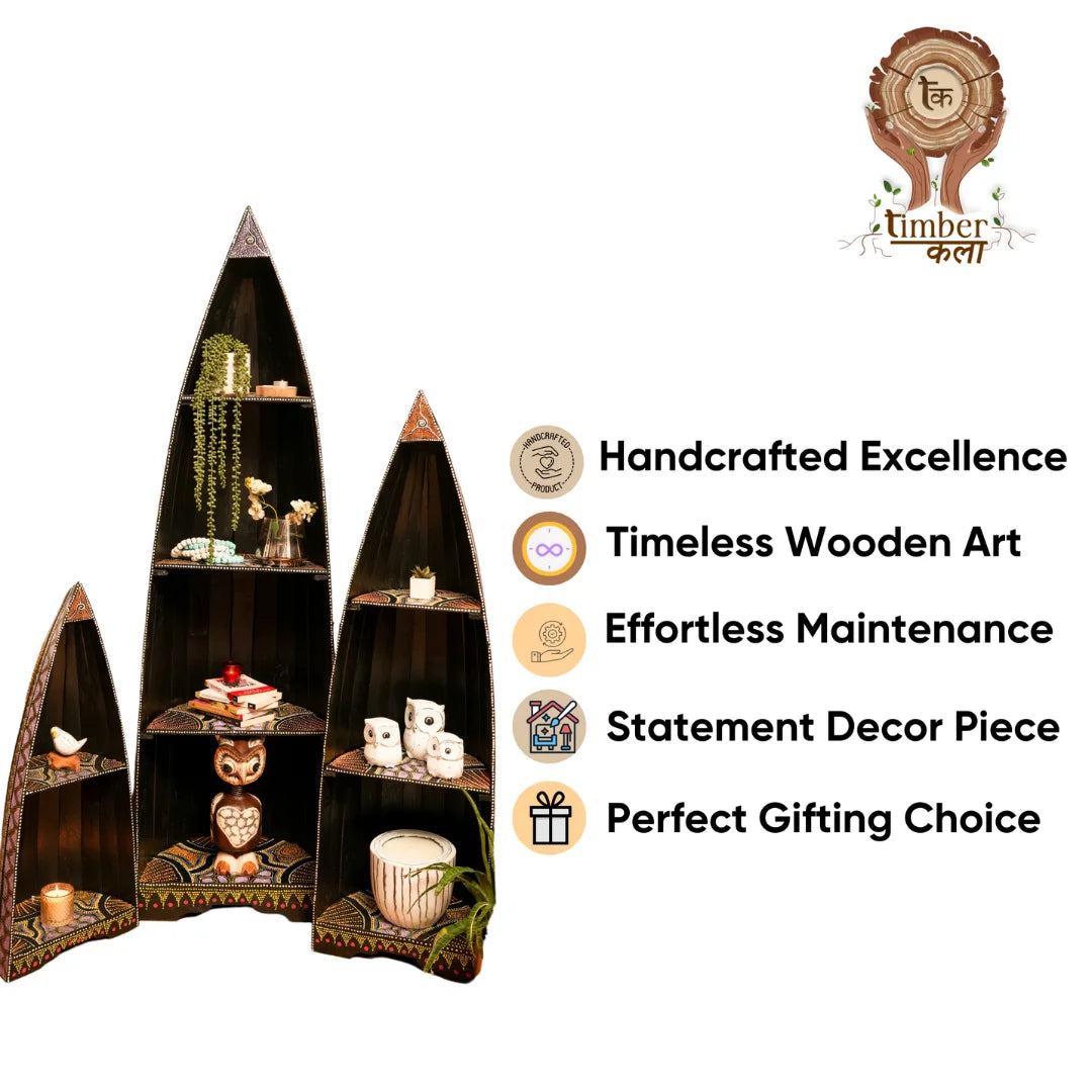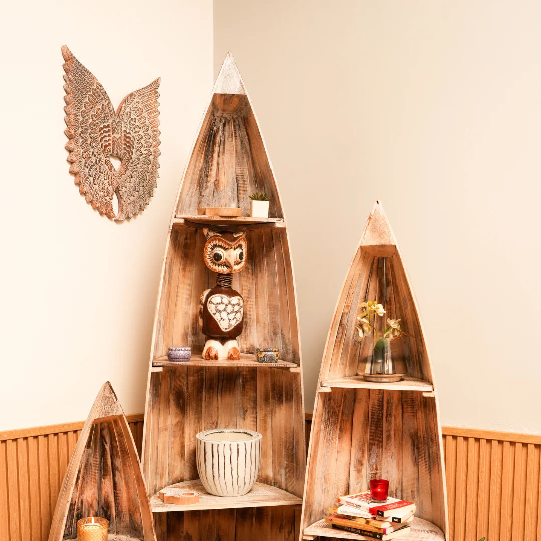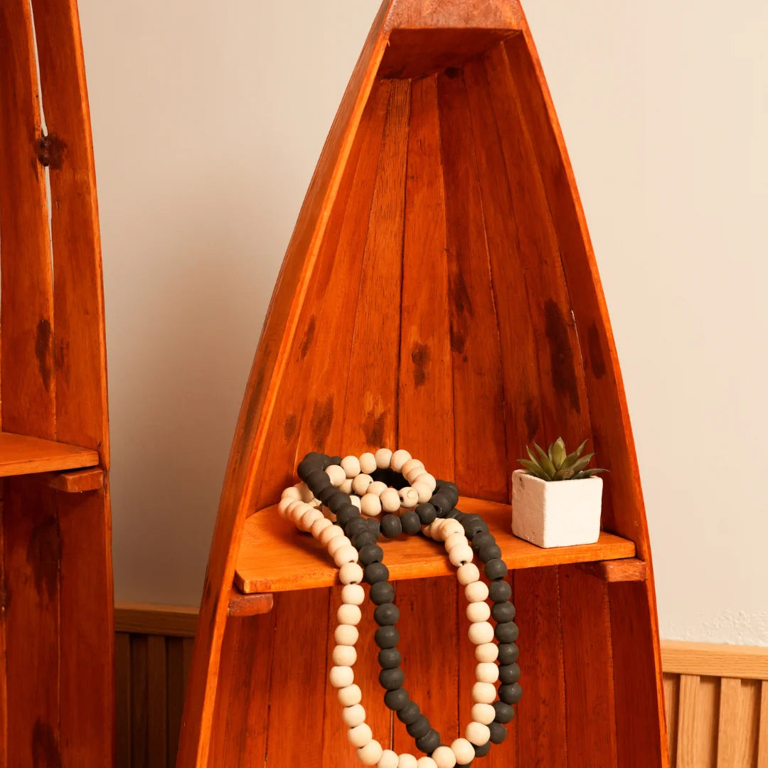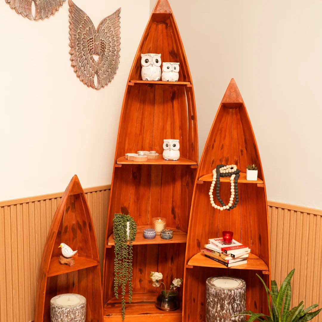 Our wooden boat-shaped rack is handcrafted from high-quality wood, ensuring a unique and rustic charm. The sturdy design and ample storage space make it perfect for storing books or decorative items . The smooth finish and natural wood grain add a touch of warmth and coziness to any room.