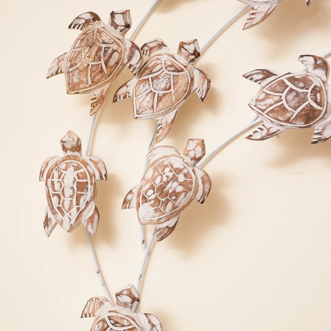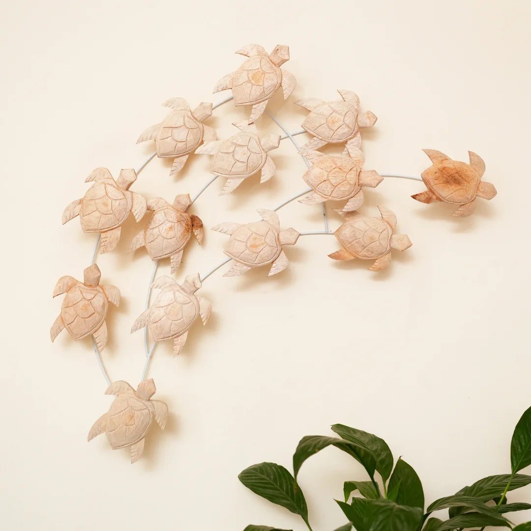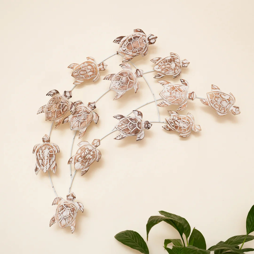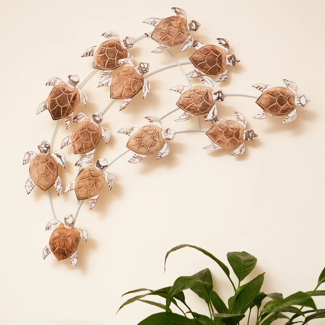 Our Nest of Turtles decorative piece is a masterpiece of craftsmanship and design. Handcrafted from high-quality natural wood, the intricately designed turtles feature delicate textures and patterns, while the sturdy metal frame provides a sleek and modern contrast. Perfect for adding a touch of ocean-inspired charm to your home, this unique piece is sure to be a conversation starter.