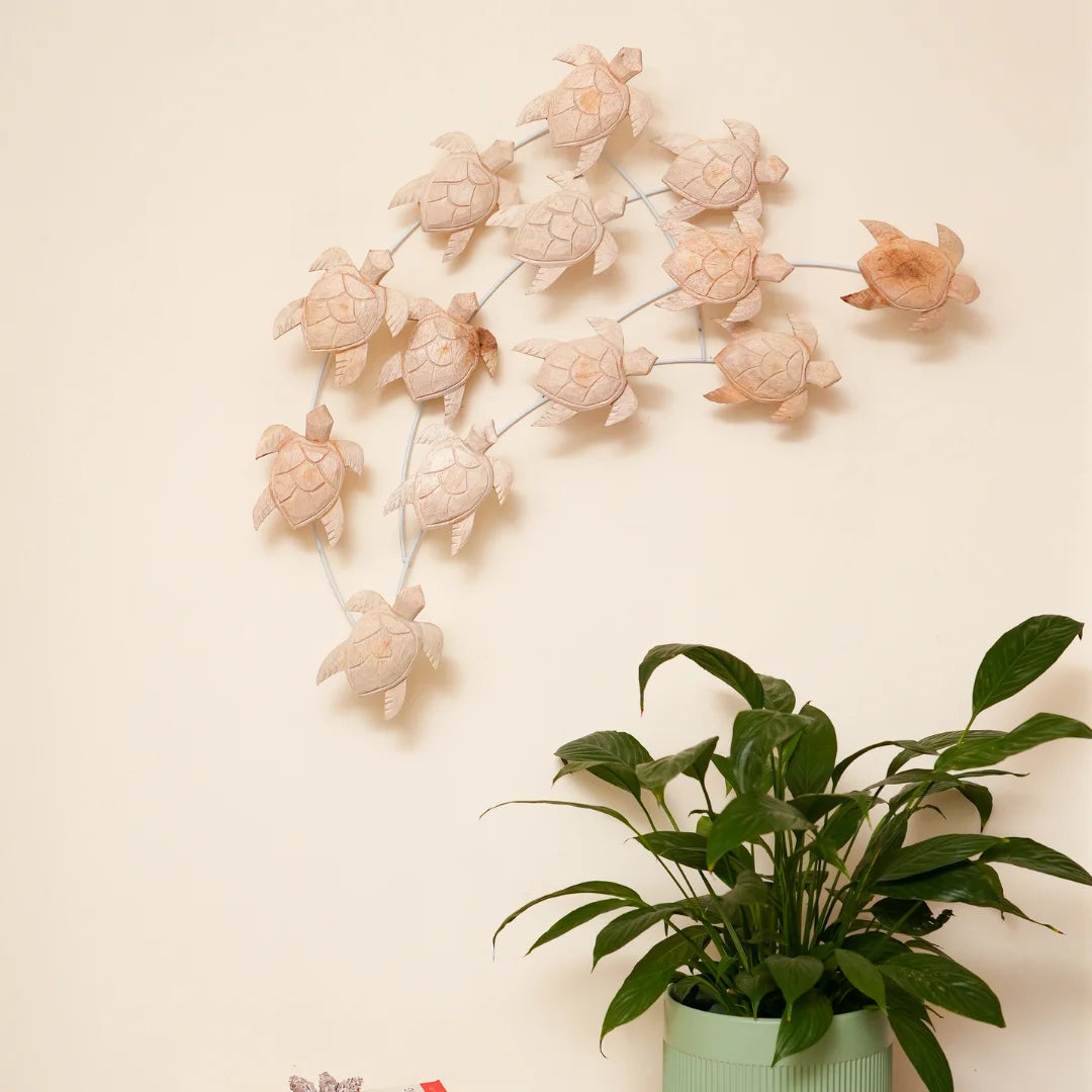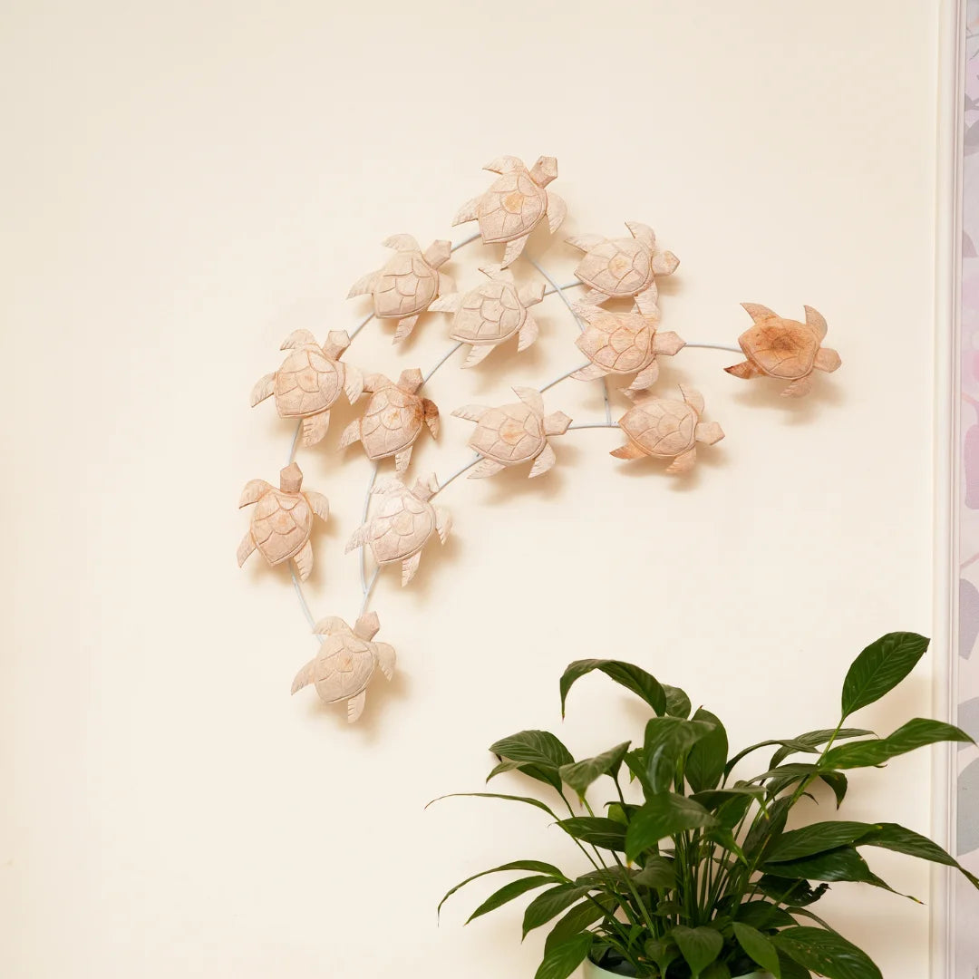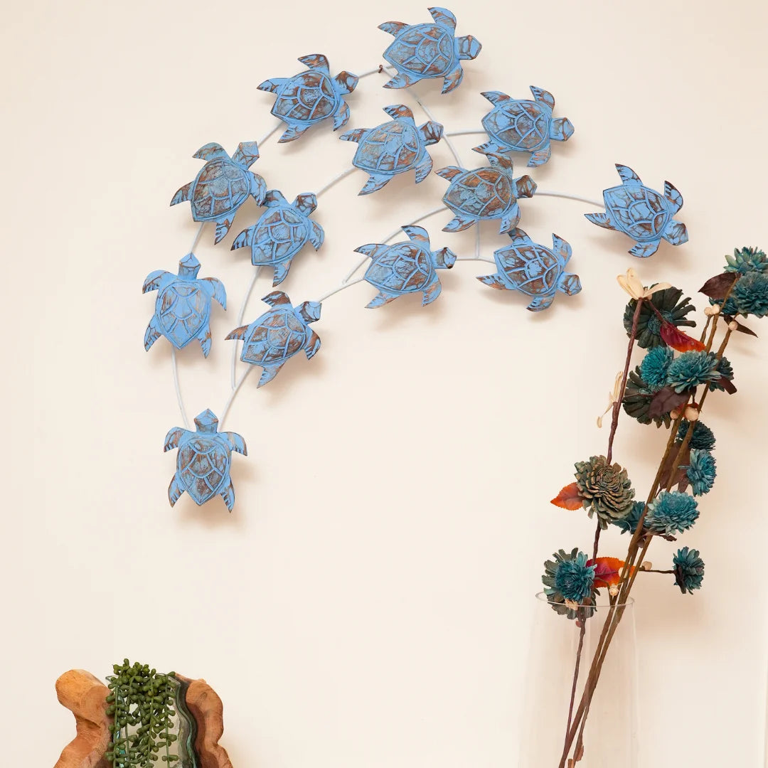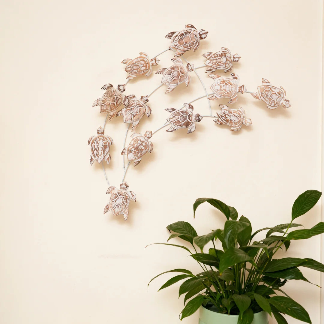 Our Nest of Turtles decorative piece is a masterpiece of craftsmanship and design. Handcrafted from high-quality natural wood, the intricately designed turtles feature delicate textures and patterns, while the sturdy metal frame provides a sleek and modern contrast. Perfect for adding a touch of ocean-inspired charm to your home, this unique piece is sure to be a conversation starter.