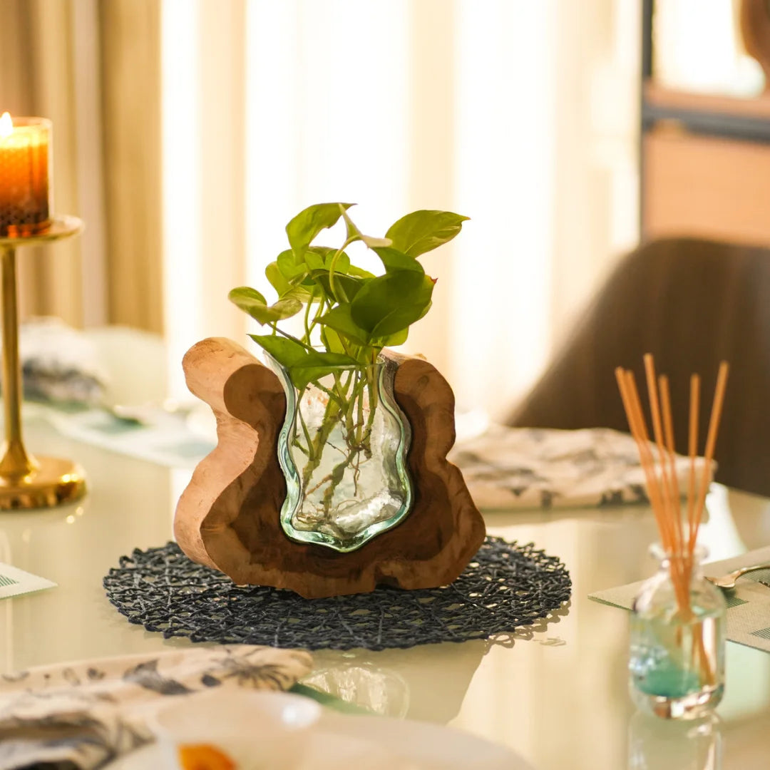 combines the natural beauty of wood with the smooth beauty of glass. Together in a wooden glass valley curves showpiece vase, the two elements exemplify the perfect blend of an organic shape, a wood base, and flowing beautiful glass that is inspired by a valley. As an artisan Glass Wood Table Decor piece, the showpiece vase adds warmth and creativity along with simplicity. The rustic valley curve vase together compliments coffee tables, dining tables, or decorative shelves beautifully. The small wooden glass root vase adds an organic artistic touch to your home and provides a simplistic touch of the soft create to the earth.