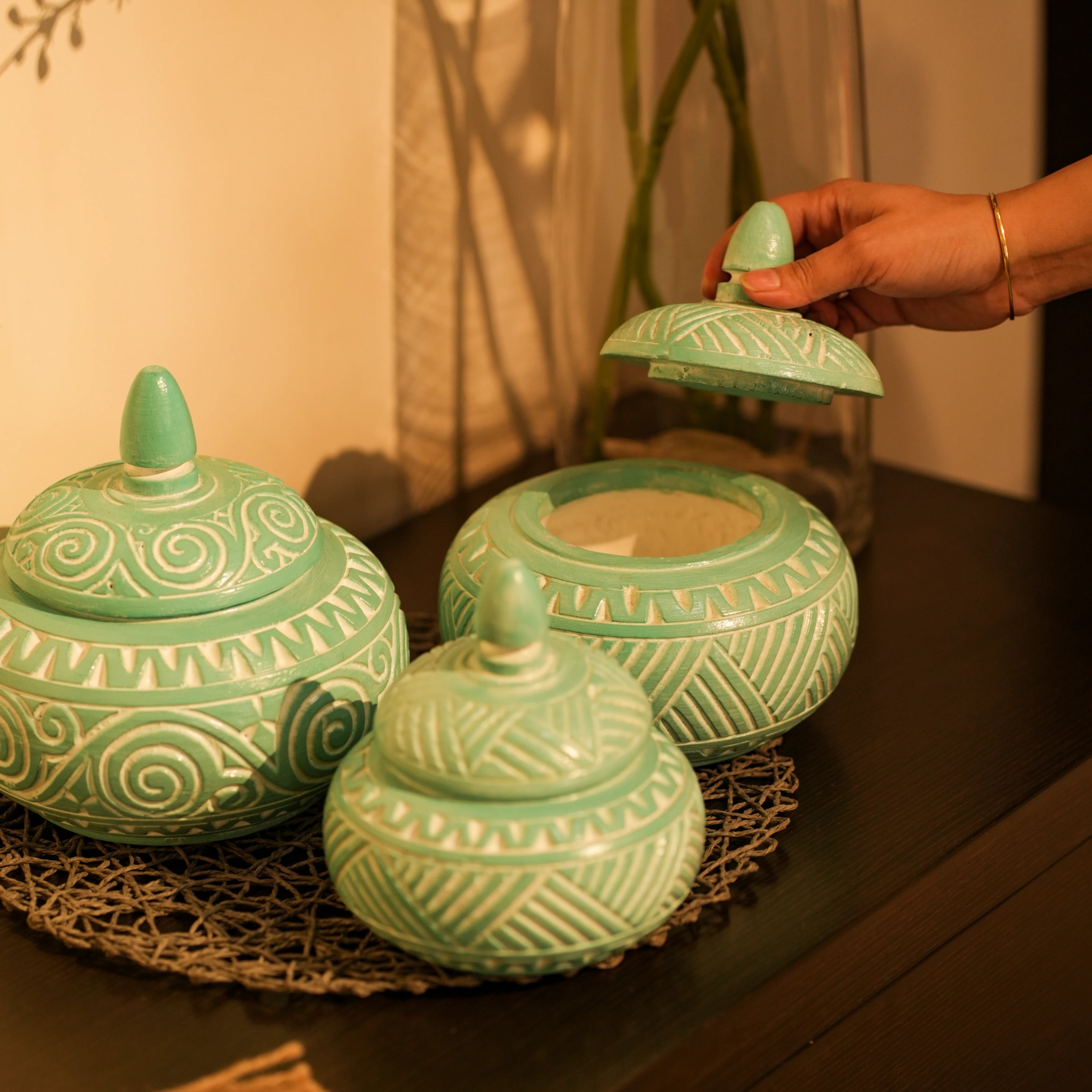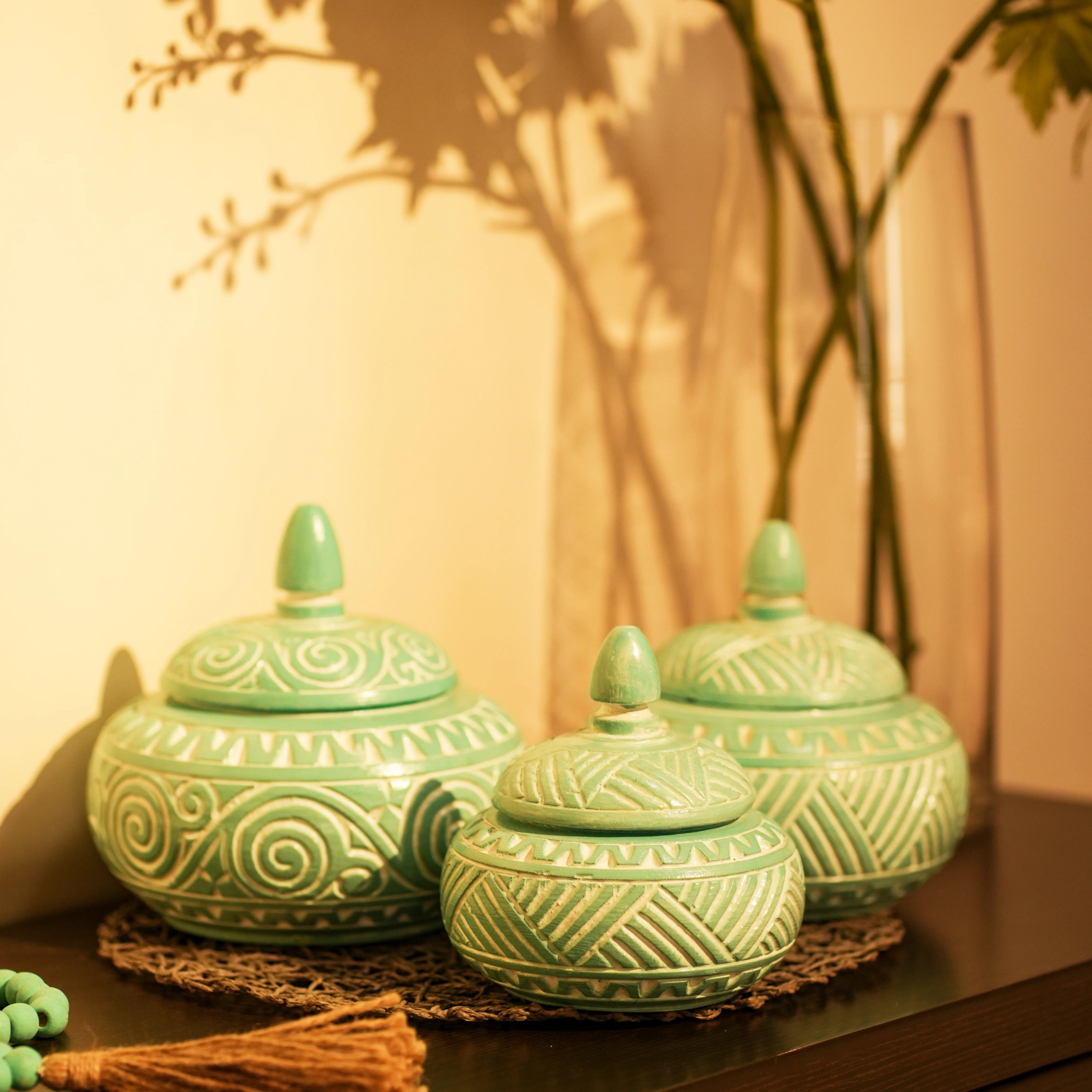 Carved Treasure jars are a set of three round, containers with intricately carved patterns featuring swirls, stripes, and other designs. Each jar has a domed lid with a pointed knob. They're perfect for adding a touch of ethnic charm to any space.